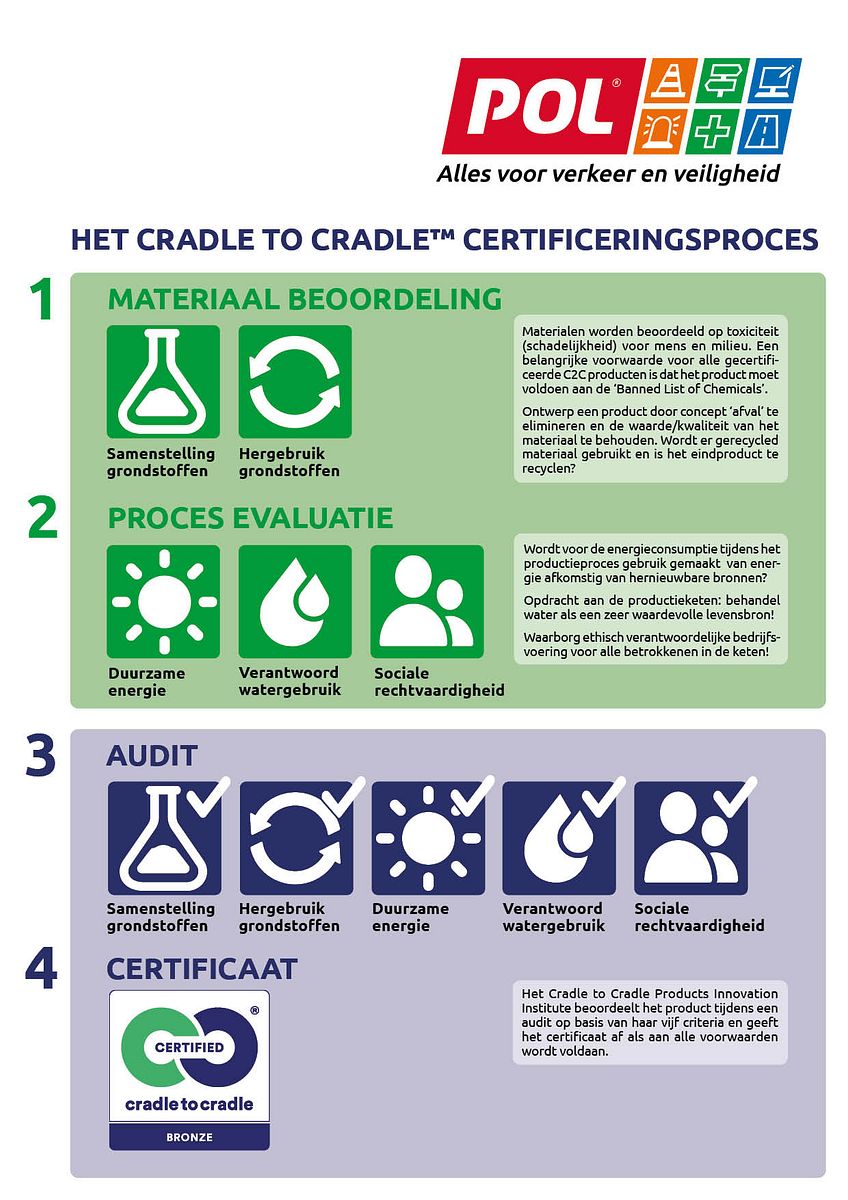 POL Heteren zet voortdurend stappen op het gebied van verduurzaming. Na de succesvolle introductie van onze refurbished Re-Sign en biobased Nabasco®Sign duurzame verkeersborden, en het behalen van het CO2-prestatieladder certificaat, ontvingen we met trots het Cradle to Cradle Certified® Bronze certificaat in 2021. Dit geldt voor onze aluminium gepoedercoate profielen die we gebruiken bij de productie van verkeersmaterialen en bewegwijzering.