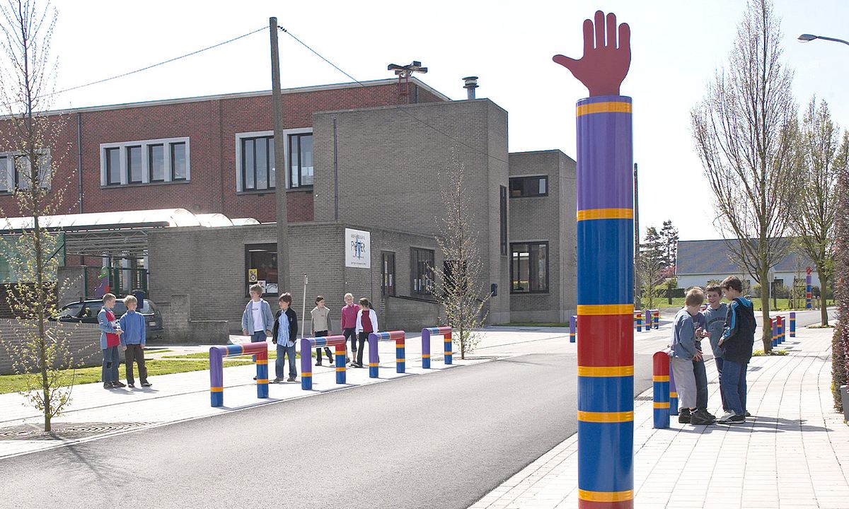 De Julie© accentpaal is een echte blikvanger door zijn omvang, vorm en kleurgebruik. De accentpaal trekt de aandacht van naderende automobilisten. Aan de bovenzijde van de paal is er een halt-hand die waarschuwt: “Opgelet! U nadert een school! Matig uw snelheid.” Bij slecht weer of in het donker, blijven de accentpalen goed zichtbaar door de retroreflecterende banden.