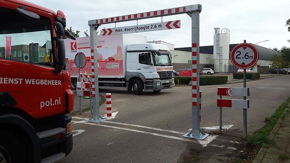 Ook op risicovolle en uitdagende locaties bieden wij effectieve oplossingen. Zo hebben wij een nieuw doorrijhoogteportaal geplaatst op een plek waar eerder ondanks duidelijke waarschuwingen regelmatig aanrijdingen plaatsvonden. Nu is er gekozen voor een extra hoge bovenligger met daaraan lange kettingen en rood-wit gemarkeerde buizen. Deze combinatie zorgt ervoor dat chauffeurs tijdig worden gewaarschuwd worden door zicht- én hoorbare signalen, terwijl het portaal zelf beschermd blijft tegen schade.
