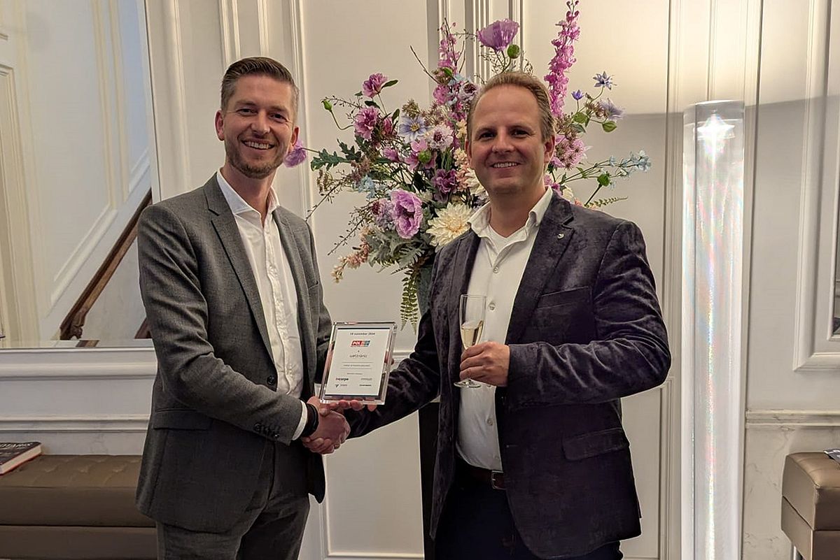 Ardjan van der Blonk, Directeur POL Heteren B.V. (links op de foto) en Mark Welling, oprichter van Weltronic (rechts op de foto) proosten op de integratie van de twee bedrijven.