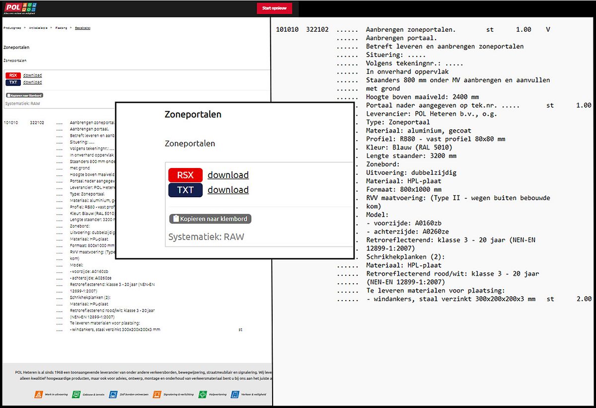 Is de productkeuze op de productpagina gedaan, volgt een RAW-bestektekst. Middels de handige download knoppen kan de bestektekst in RSX of TXT formaat worden binnengehaald en worden toegevoegd aan het infrabestek. In de grond-, weg- en waterbouw is een RAW-bestekservice nou eenmaal een must, ideaal dus dat de verkeersproducten van POL Heteren nu beschikbaar zijn!