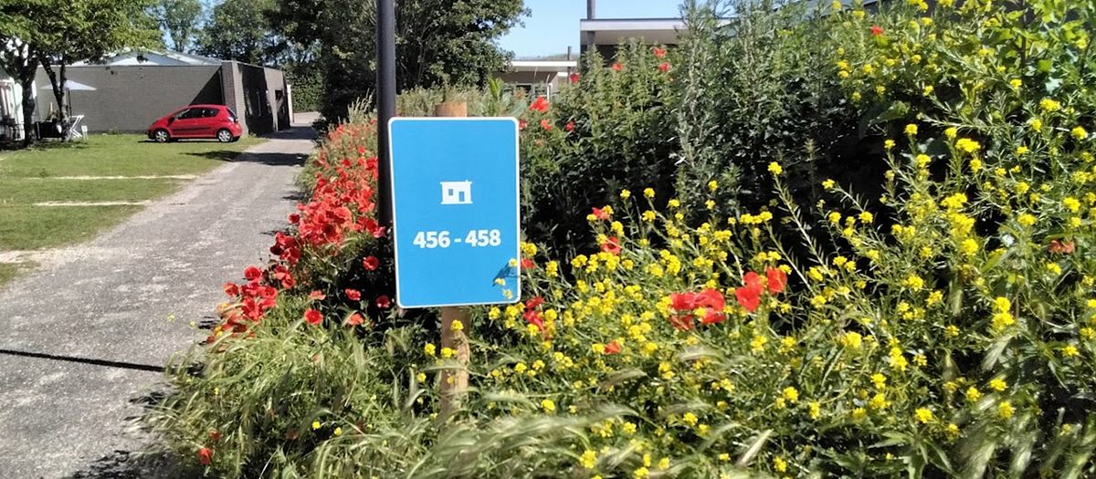 De nummers van de accomodaties worden aan het begin van een veld weergegeven op een dubbelomrand verkeersbord.