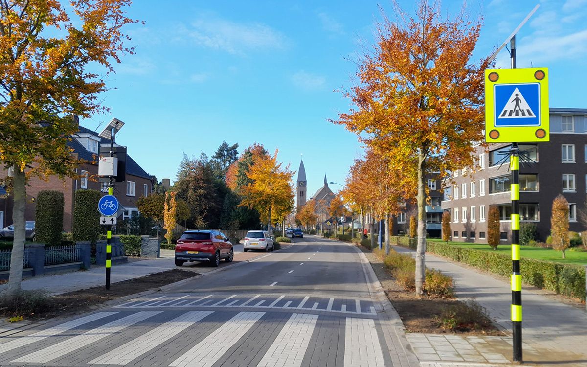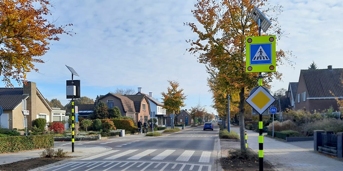 Om voetgangers de kans te bieden veilig over te steken hebben we recent een aantal voetgangersoversteekplaatsen (VOP’s) beveiligd in Boekel met borden met alternerende knipperlampen.
