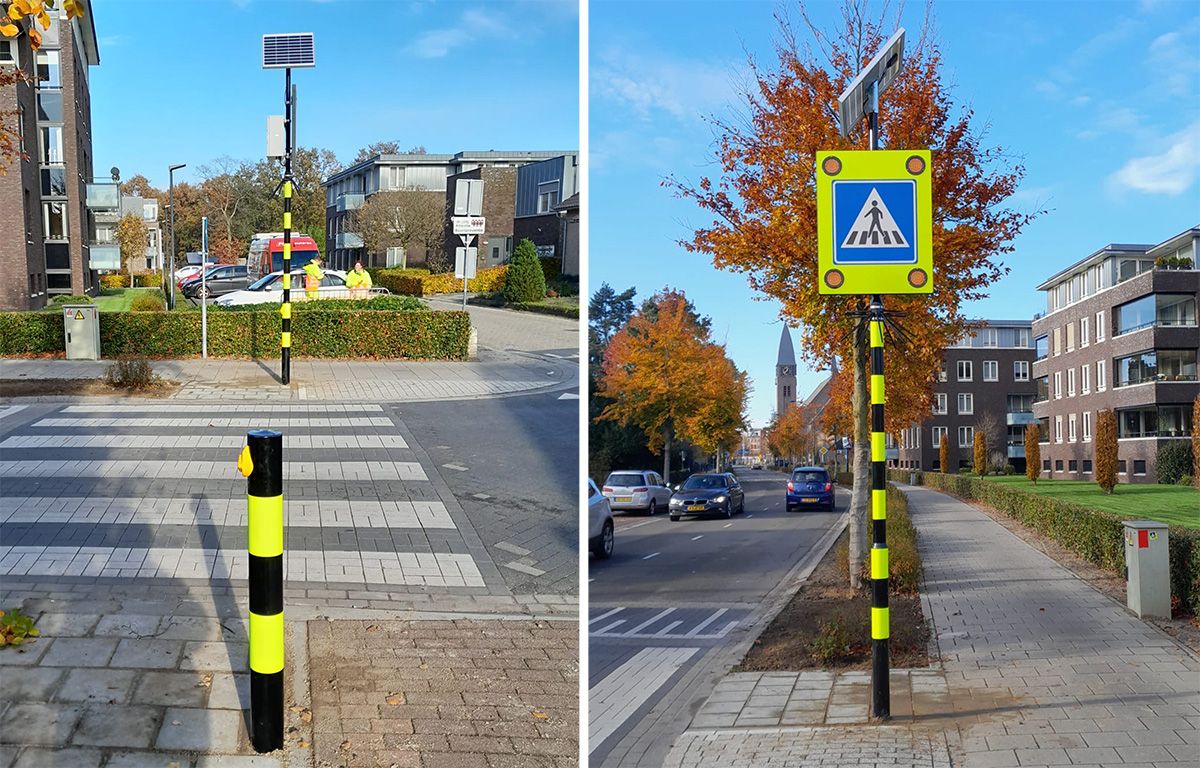 Veilig oversteken met een LED-waarschuwingsbord met drukknop
