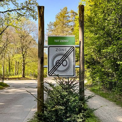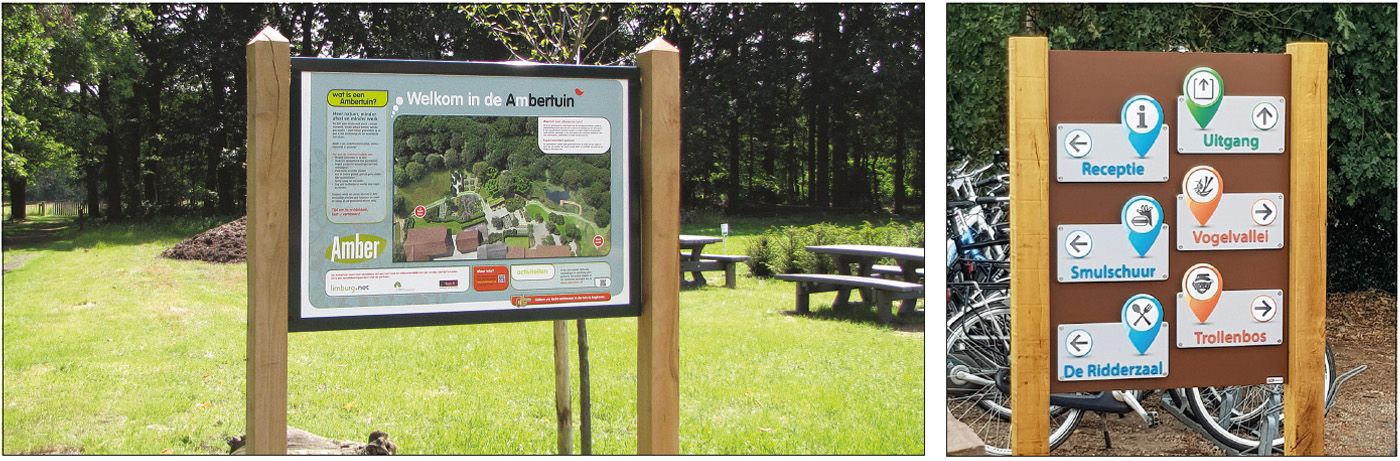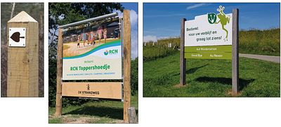 Een mooie groene omgeving verdient een entreeportaal met een natuurlijke uitstraling. Dus in bosrijk gebied gaan houten portaalborden mooi in hun omgeving op. Ook langs de waterkant kan worden gekeken naar een link met de omgeving. Zo zijn eikenhouten palen met een afgeschuinde en wit geverfde kop (die daarmee lijken op aanmeerpalen) een leuke verwijzing. Zeer geschikt dus als staander van een entreeportaal bij een jachthaven of een waterpark.