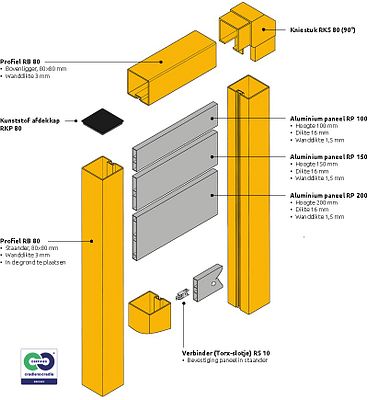 Het aluminium RB 80 profiel bestaat naast het vierkante buis profiel 80x80 mm uit verschillende (optionele) onderdelen: