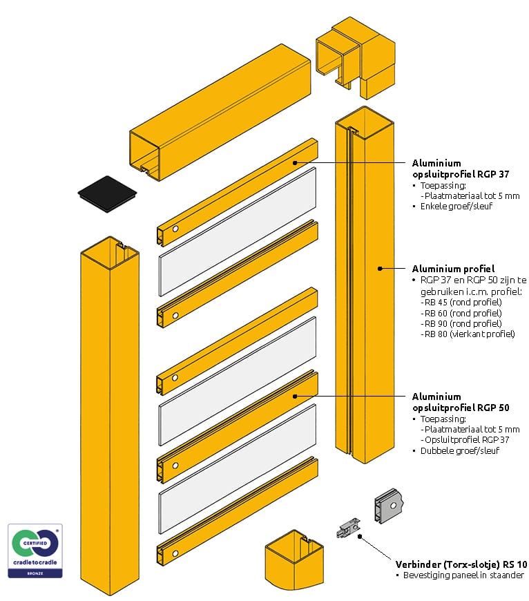 Het RPG opsluit- of hulpprofiel is geschikt voor gebruik in combinatie met de onderstaande aluminium P-Sign profielen: