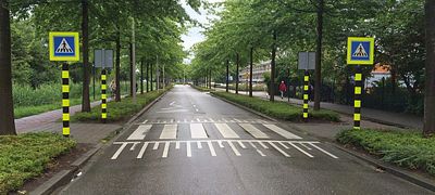 Een oversteekplaats markeren met fluorescerende attentiekokers en verkeersborden is een voordelige, maar uiterst effectieve oplossing om zones te markeren. Voor automobilisten is direct duidelijk dat voetgangers en/of fietsers kunnen oversteken. De attentiekoker is uitgevoerd met Klasse 3 retroreflecterende folie en heeft een zeer hoge attentiewaarde, zowel overdag als ‘s nachts. De koker is 2200 mm lang en wordt op een standaard flespaal van 3900 mm gemonteerd met een vrije doorloophoogte voor voetgangers. Bovenop kan enkel- of dubbelzijdig een verkeersbord gemonteerd worden.