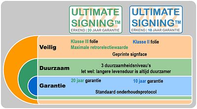 In onderstaande tabel zijn de verschillende combinaties van drager en beeldvlak op basis van levensduur en reflectie weergegeven. De ‘Ultimate Signing 2022’ standaard is door de branchevereniging VNVF (Vereniging Nederlandse Verkeersborden Fabrikanten) uitgebracht.