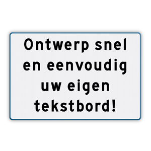 Een tekstbord kopen? Bij POL Heteren kunt u uw eigen tekstbord ontwerpen. De borden kunnen worden gebruikt als onderbord, informatief bord of als bord met waarschuwende tekst. U kiest zelf de toepassing die bij de betreffende situatie past. In onze tekstbord configurator kunt u eenvoudig uw eigen voorkeuren kiezen en het bord personaliseren naar uw eigen wensen. Selecteer een template om de configurator te openen en plaats uw eigen tekst. Ontdek de mogelijkheden!